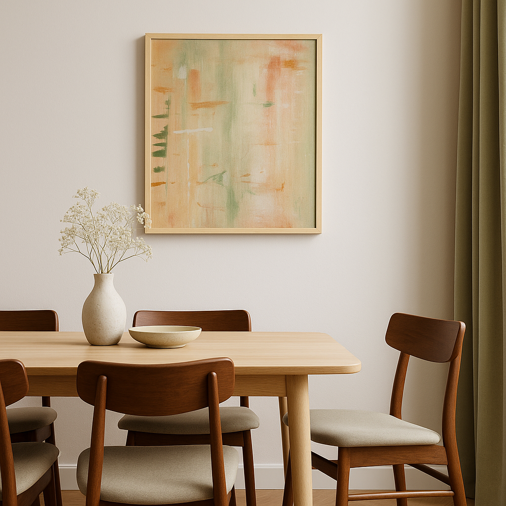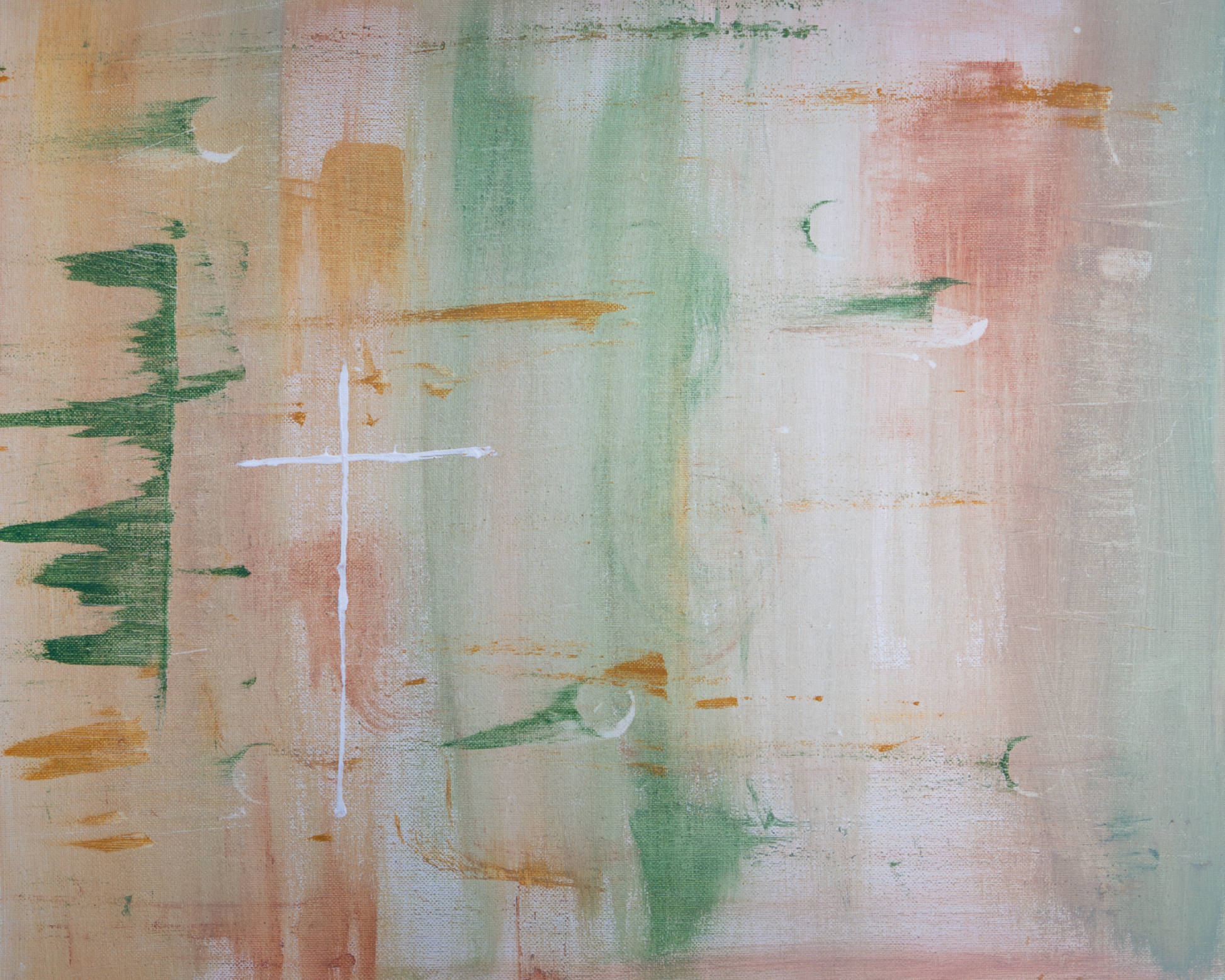 This 16x20-inch abstract painting features soft, earthy tones of sage green, warm peach, and golden hues layered gently across the canvas. A subtle white cross emerges in the composition, offering a quiet but steady symbol of faith, guidance, and inner transformation. The textured strokes and muted palette evoke a sense of stillness, process, and peace—reminding us that we are all still becoming who we were created to be.